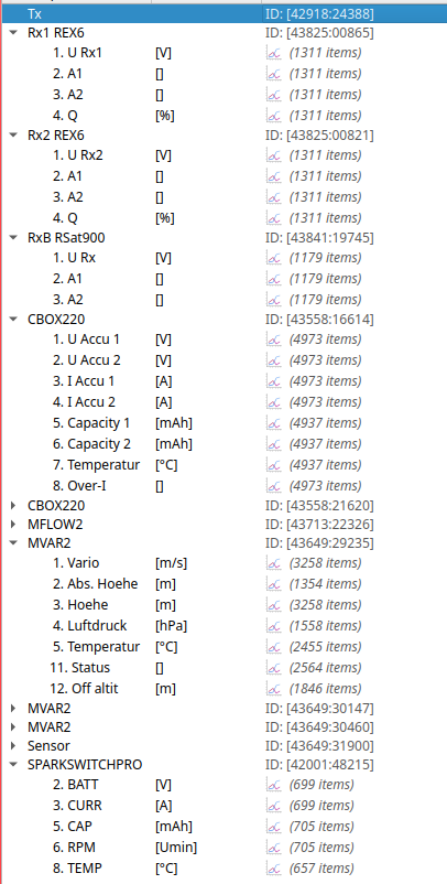 Und vielleicht ist die ganze Geschichte einfacher, und es hat nichts mit dem Wechsel der Empfänger zu tun. Vielleicht gibt es einfach einen ‘Schalter’: sobald die Q-Datenrate unter einen bestimmten Wert kommt, oder für längere Zeit abwesend ist. Aber dazu muss ich noch mehr Logs sehen. Nur Jeti kann dazu etwas sagen , wir sehen nur die Symptome, nicht den Code, der entscheidet, welche Meldung rauskommt. Bin mir auch noch nicht sicher, ob diese Meldung in der CBox erzeugt wird oder erst im Sender. Denke, in der CBox, aber alles ist möglich.