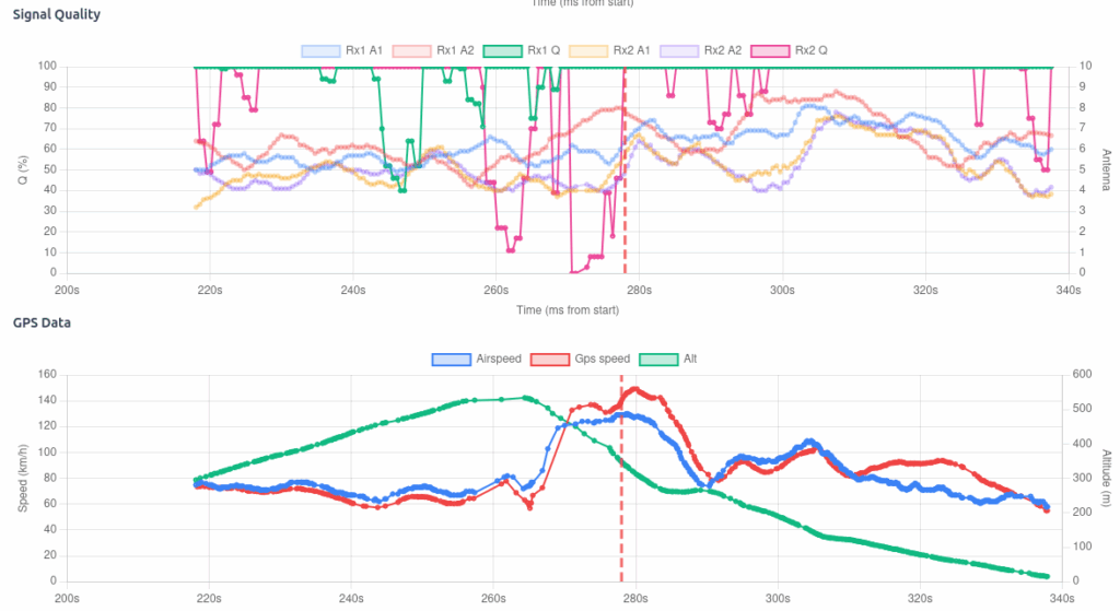- Rx1-Signal verschlechtert sich (~500 ms-Lücken 3–9 s vorher)